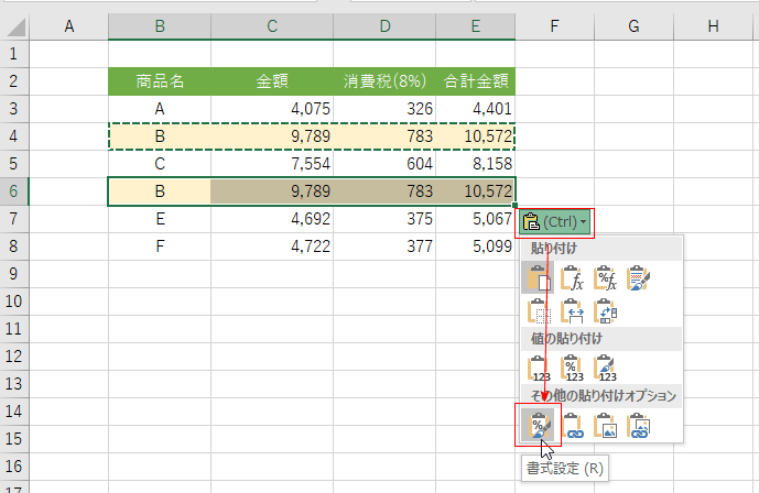 - 書式を貼り付けたいセル範囲 B6:E6セル、B8:E8セルを選択します。