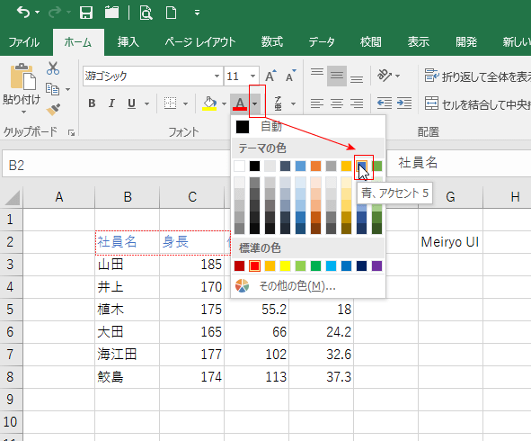 下図ではB2:E2セルを選択して、「青、アクセント5」を選択しています。すると、画面では色がプレビューされます。