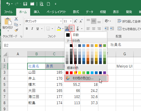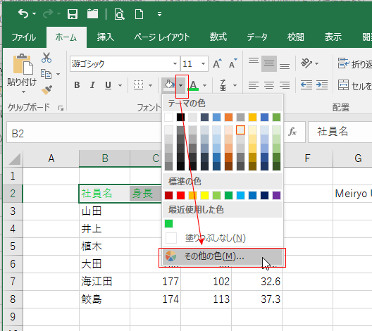 カラーパレットに変更したい色がないときは「その他の色」を選択します。