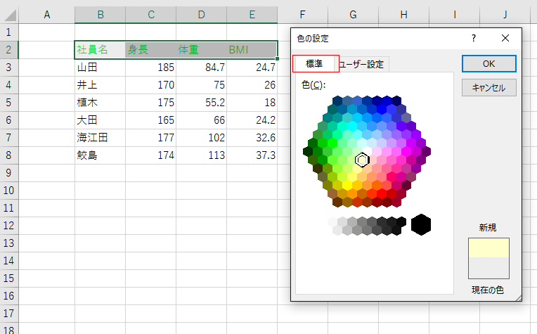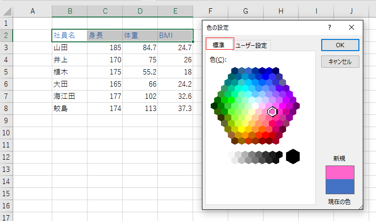 「標準」タブを選択すると、色がハチの巣状に配置されたカラーパレットが表示されますので、そこから選択します。