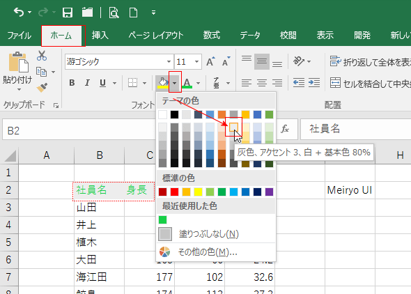 下図ではB2:E2セルを選択して、「灰色、アクセント3、・・・・」を選択しています。すると、画面では色がプレビューされます。