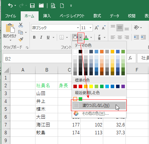 塗りつぶしの色を解除するときは「塗りつぶしなし」を選択します。