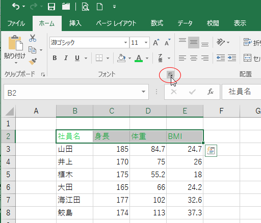 セルの書式設定 ダイアロゴボックスの[フォント]タブが開きます。