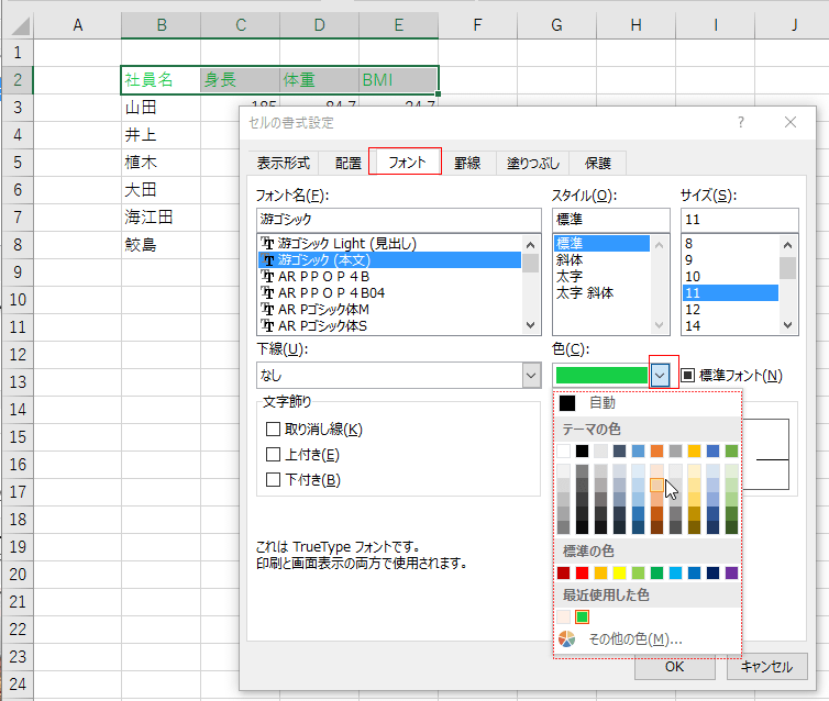 フォントの色やセルの色をダイアログボックスから設定する