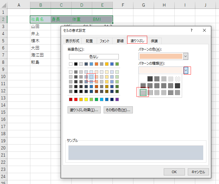 セルの塗りつぶしは、[塗りつぶし]タブを選択します。