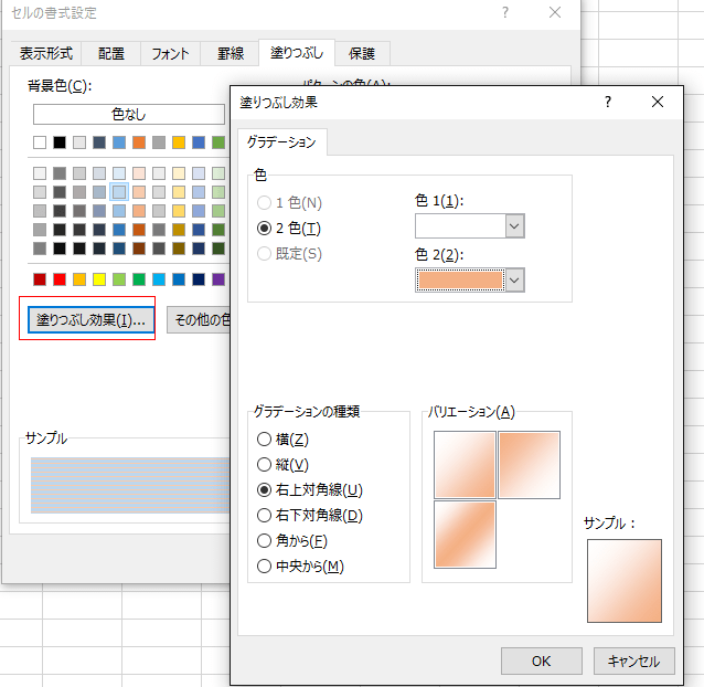 また「塗りつぶし効果」を選択すると、グラデーションの設定を加えることができます。