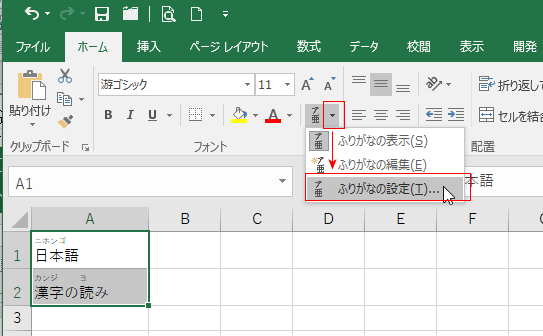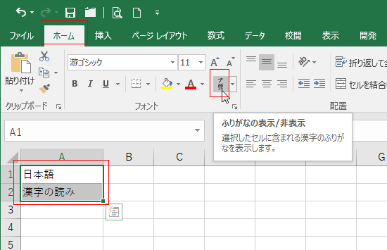 - ふりがなを表示したいセルを選択します。