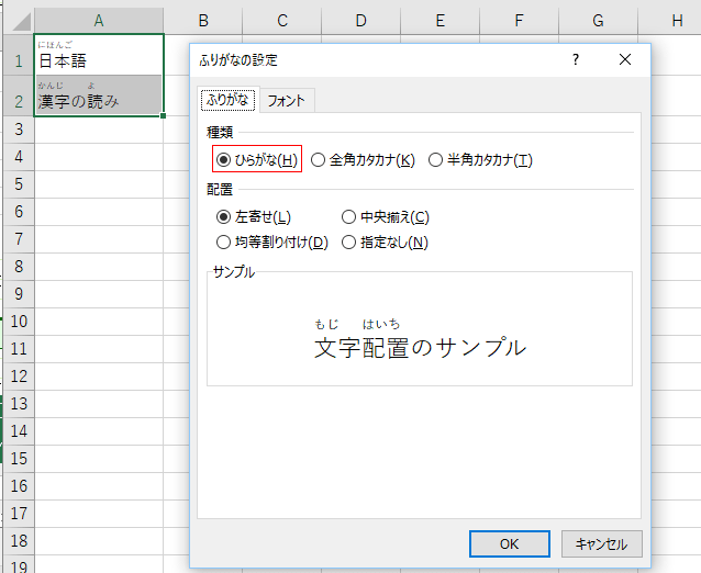 - [ふりがな]タブの種類で「ひらがな」にチェックを入れるとふりがながひらがなで表示されます。