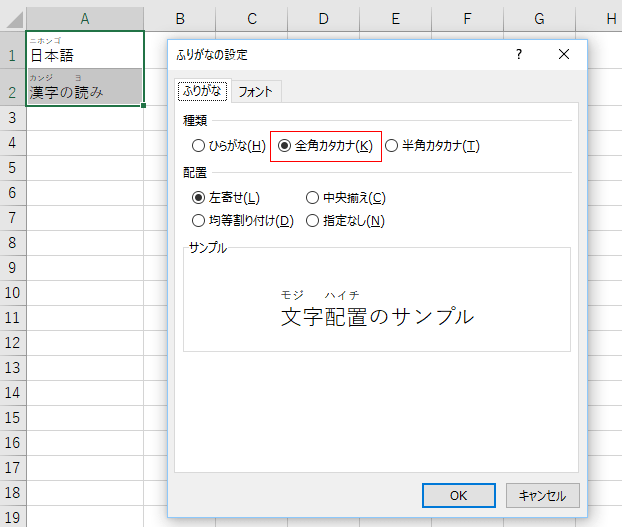 - [ふりがな]タブの種類で「全角カタカナ」にチェックを入れるとふりがなが全角カタカナで表示されます。
