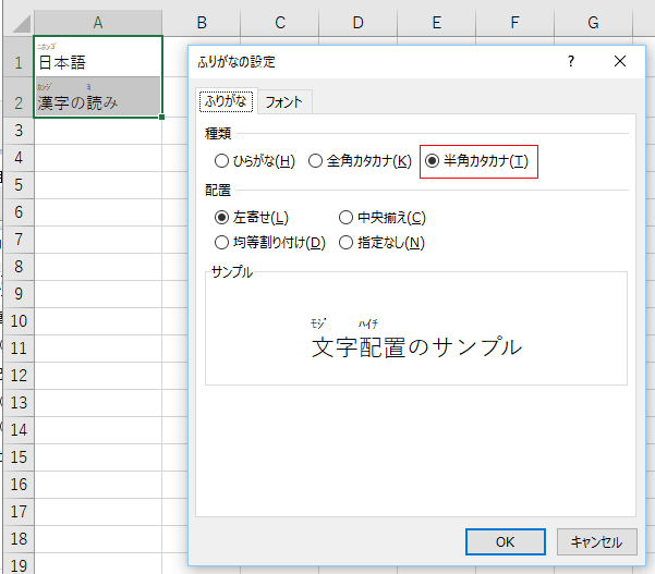 - [ふりがな]タブの種類で「半角カタカナ」にチェックを入れるとふりがなが半角カタカナで表示されます。
