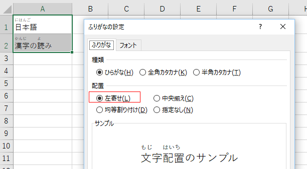 - [ふりがな]タブの配置で「左寄せ」にチェックを入れるとふりがなが漢字に対して左寄せで表示されます。