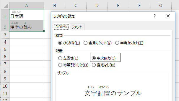 - [ふりがな]タブの配置で「中央揃え」にチェックを入れるとふりがなが漢字に対して中央に揃えて表示されます。