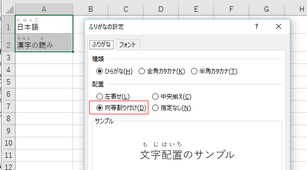 - [ふりがな]タブの配置で「均等割り付け」にチェックを入れるとふりがなが漢字に対して均等に割り付けて表示されます。