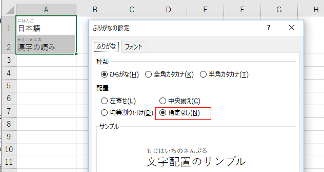 - [ふりがな]タブの配置で「指定なし」にチェックを入れるとふりがなとともにひらがなも併せて左寄せで表示されます。