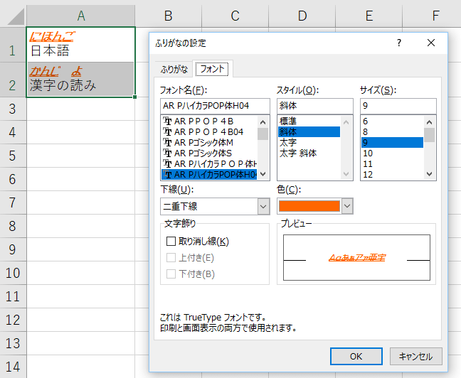 - [フォント]タブではふりがなのフォントの種類、フォントのスタイル、フォントのサイズ、下線、フォントの色などを設定することができます。