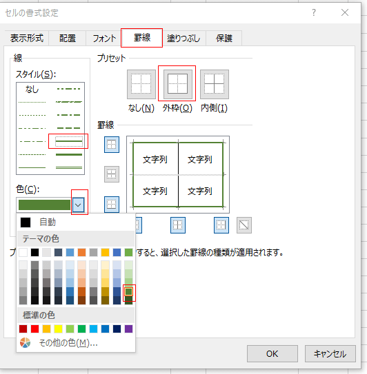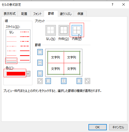 | xlInsideVertical | 11 | 範囲内のすべてのセルの垂直罫線 |