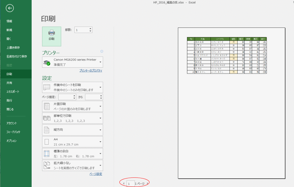 - Ctrl + P で バックステージの印刷を開きます。