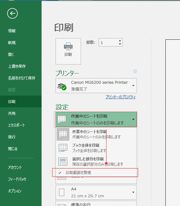 設定で「印刷範囲を無視」を選択します。