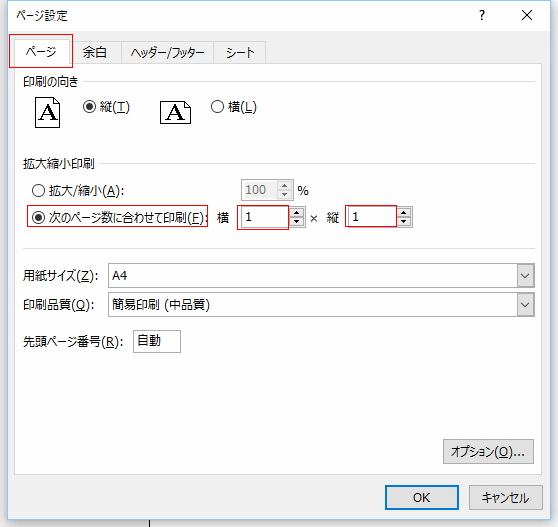 「次のページ数に合わせて印刷」にチェックを入れ、横 1 × 縦 1 と設定します。