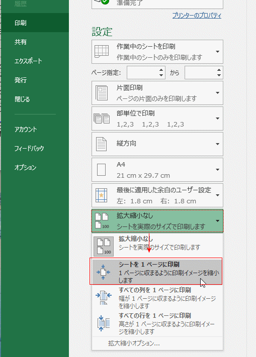 下端にある「拡大縮小なし」のボタンをクリックして、「シートを1ページに印刷」を選択します。