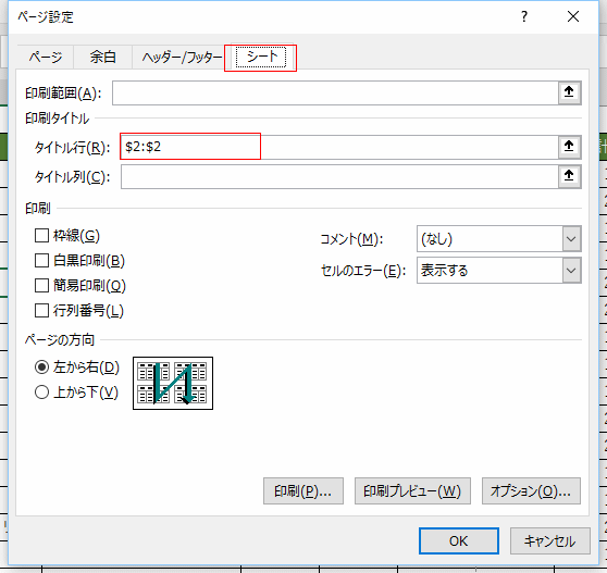- [シート]タブの印刷タイトルのタイトル行にタイトルとしたい行を指定します。この画面では 2行目を設定しています。