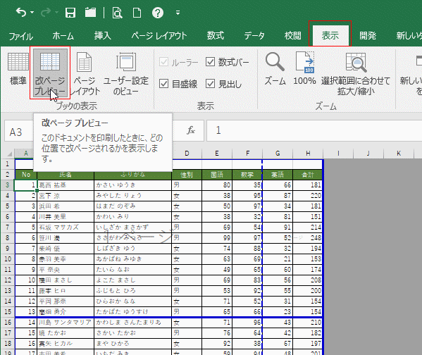 - [表示]タブの[改ページプレビュー]をクリックします。