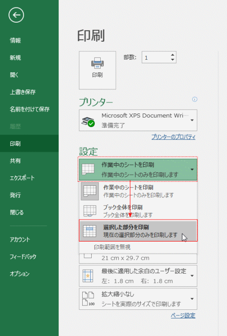 設定で「選択した部分を印刷」を選択します。