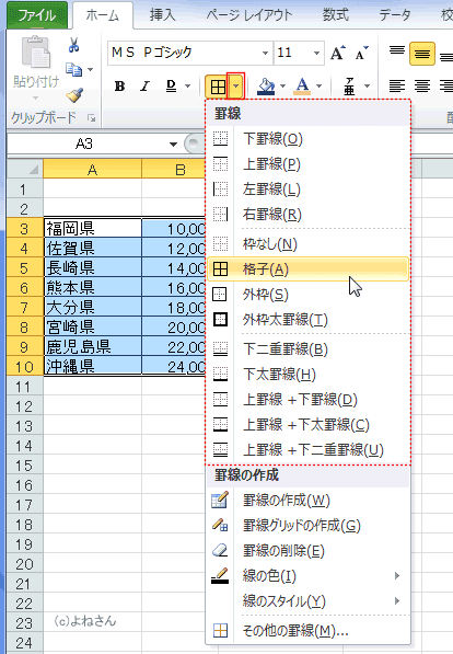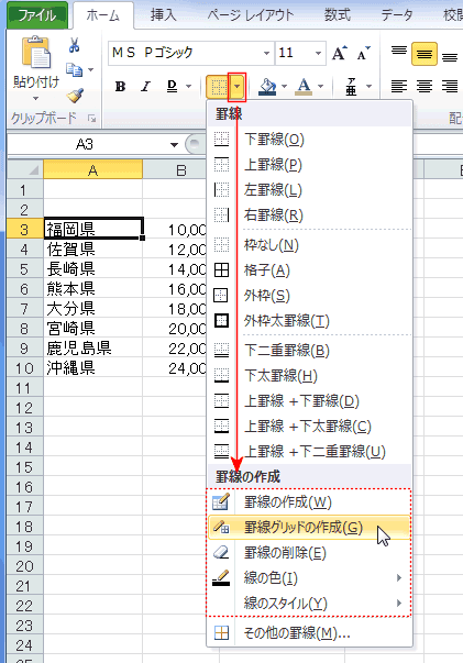- 罫線ボタンの右の▼をクリックしてドロップダウンリストを表示します。