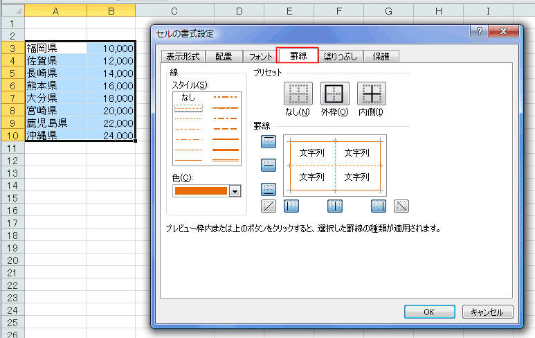 - セルの書式設定ダイアログの「罫線」タブが開きます。