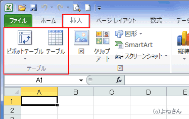 よねさんのExcelとWordの使い方|エクセル2010 コマンド解説:目次|エクセル2010 コマンド解説:挿入タブのテーブル グループ