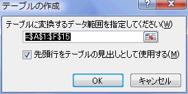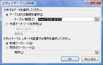 - ピボットテーブルのコマンドボタンの上の部分を選択すると、「ピボットテーブルの作成」ダイアログボックスが開きます。