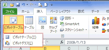 - ピボットテーブルのコマンドボタンの下の部分を選択すると、ピボットテーブルとピボットグラフの選択メニューが出ます。