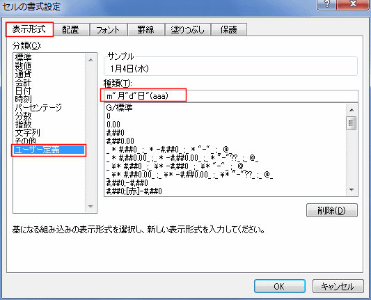 - A1セルの表示形式はyyyy"年"m"月"d"日("aaa")" としています。