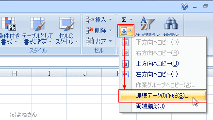 - [ホーム]タブの[編集]グループにある[フィル]→[連続データの作成]を実行します。