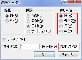 こちらは「停止値」に最終日を指定して、その値までの連続データを作成します。