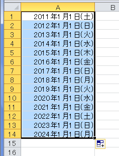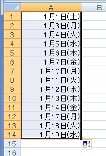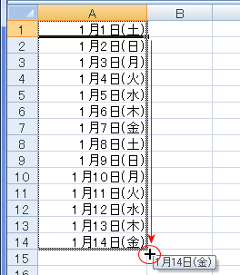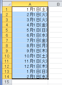 - A1セルに開始値「1/1」を入力し、フィルハンドルをA14セルまでドラッグした例です。