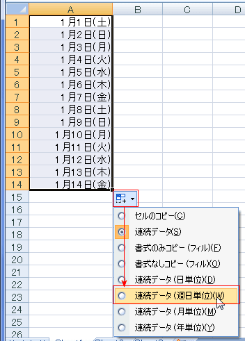 - オートフィルオプションをクリックして、「連続データ(週日単位)」を選択します。