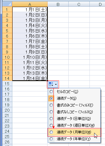 - オートフィルオプションをクリックして、「連続データ(月単位)」を選択します。