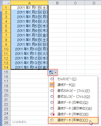 よねさんのExcelとWordの使い方|エクセル2010基本講座:目次|データ/数式/関数の入力|オートフィル(日付)