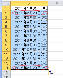 - 2012年は閏年で2月は29日までですので、その日付が入力されています(A14セル)。
