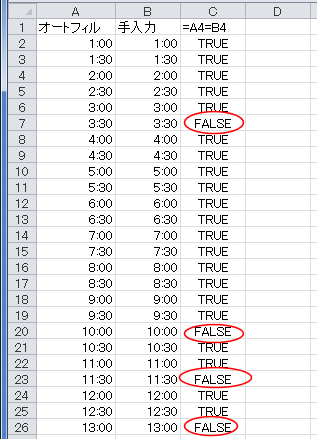 オートフィルで作成した時刻とキーボードから入力した時刻では異なったものになっていることがわかります。