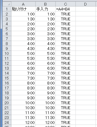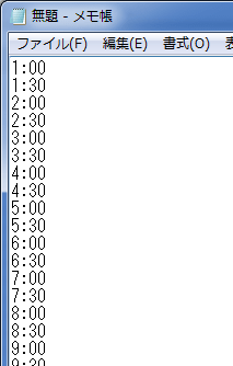 B列にキーボードから「1:00」「1:30」「2:00」・・・と入力します。
