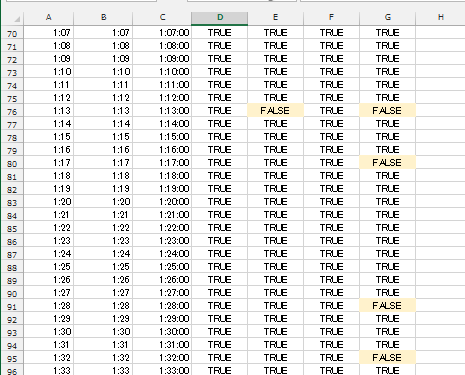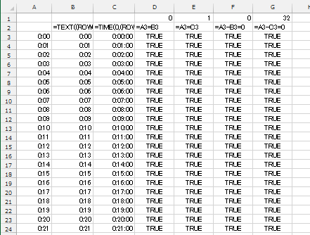TIME関数を使った数式では 1:13 のところでFalseとなっているのが分かります。