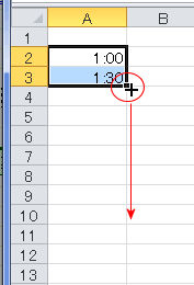 A2に「1:00」 A3に「1:30」と入力し、A1:A3を選択してフィルハンドルをドラッグします。