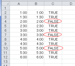 なお、TIME関数を使ったケースでは30分毎の場合はTRUEとなりました。