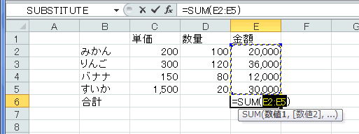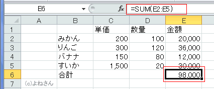 - E6セルに計算結果「98000」が表示され、数式バーには数式「=SUM(E2:E5)」が表示されます。