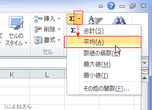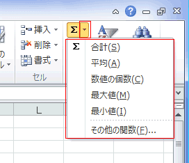 - オートサムボタンの右側の[▼]をクリックすると、平均、数値の個数、最大値、最小値が入力できます。