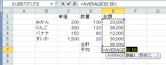 - E7セルにAVERAGE関数を使った数式ができました。