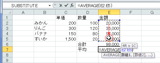 - 平均する範囲はE2:E5ですので、マウスでセル範囲E2:E5をドラッグして指定します。