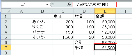 - 平均値を表示するE7セルを選択します。
